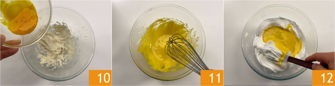 Incorporez les jaunes d'œufs 10 et mélangez à nouveau 11. Versez ce mélange dans le bol contenant les blancs en neige et mélangez délicatement de bas en haut pour ne pas faire retomber le mélange 12. Placez le tout au réfrigérateur pendant que vous préchauffez le four à 160°C.