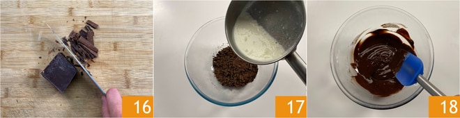 Pendant ce temps, préparez la ganache : hachez le chocolat noir 16 et mettez-le dans un bol, puis ajoutez la crème chaude 17 et mélangez jusqu'à ce que tout le chocolat soit fondu 18.