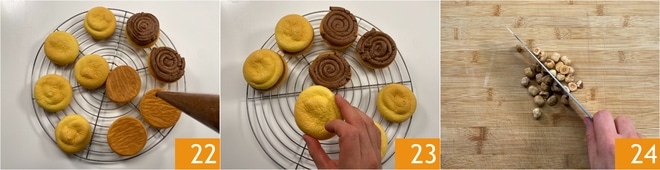 Transférez la ganache dans une poche à douille et garnissez 5 dômes 22, puis recouvrez avec les autres 23. Hachez les noisettes 24.