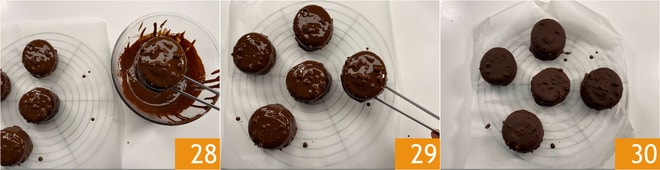 Plongez les tartelettes dans le chocolat, puis égouttez-les pour enlever l'excès 28. Posez-les sur une grille 29 et laissez le glaçage durcir. Vos chocolate pie cake au chocolat sont prêtes à être dégustées 30 !