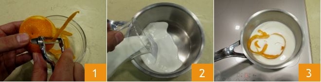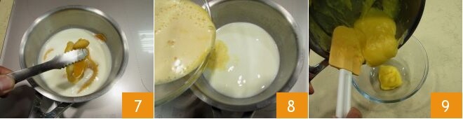 Une fois le temps écoulé, retirez le zeste des mandarines du lait chaud 7 et ajoutez la crème. Versez le mélange de jaunes que vous avez préparé dans le mélange lait-crème 8 et mélangez le tout, puis remettez sur le feu jusqu'à ce que la crème épaississe. Une fois prête, versez la crème dans un récipient 9 et laissez refroidir complètement,