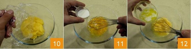 en la couvrant de papier film au contact 10. Entre-temps, préparez la pâte des gaufres au cacao : faites fondre le beurre (au micro-ondes ou au bain-marie) et laissez-le tiédir. Dans un bol, cassez les œufs, puis délayez-les avec le lait à l'aide d'un fouet 11. Ajoutez également le beurre fondu désormais tiède 12 et