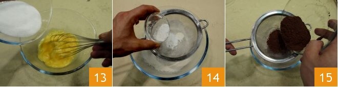le sucre, en continuant de mélanger 13. Dans un autre récipient, tamisez la farine avec la levure 14 et le cacao amer 15.