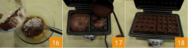Ajoutez les ingrédients secs tamisés aux œufs et mélangez 16 jusqu'à obtenir une pâte homogène sans grumeaux. Chauffez le gaufrier et versez une louche de pâte pour chaque portion, en l'étalant uniformément sur la plaque 17. Fermez la plaque et laissez cuire pendant 3-4 minutes : avec la nôtre, vous devriez obtenir 4 gaufres. Une fois prêtes 18,