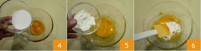 Entre-temps, dans un bol à part, fouettez les jaunes d'œufs avec le sucre 4 et la fécule de maïs 5. Mélangez bien avec le fouet 6 jusqu'à obtenir un mélange homogène.