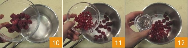 Pendant ce temps, vous pouvez préparer la sauce aux fruits rouges : dans une casserole, versez le sucre, les framboises 10, les groseilles 11 et 5 g d'eau 12