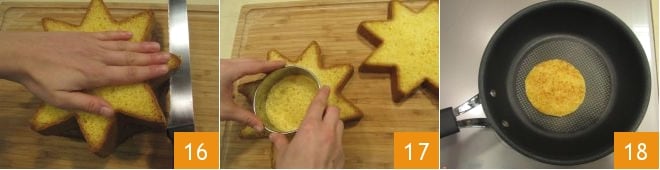 Après le temps de refroidissement de la mousse, vous pouvez procéder à la composition du dessert : coupez le pandoro en tranches horizontales d'environ 1 cm d'épaisseur 16 et découpez des disques à l'aide d'un emporte-pièce de 9 cm de diamètre 17. Déposez les disques de pandoro sur une poêle chaude et faites-les légèrement griller des deux côtés 18.