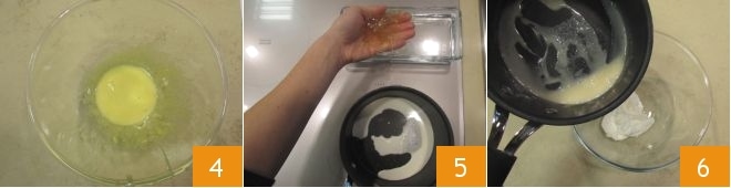 et continuez à travailler le mélange jusqu'à ce qu'il soit froid 4 : vous obtiendrez ainsi une pâte à bombe. Ensuite, chauffez environ 20 g de crème, essorez les feuilles de gélatine et faites-les fondre dans la crème chaude 5, en mélangeant soigneusement. Tamisez la ricotta dans un bol, versez le mélange de crème et de gélatine dans le bol 6 et travaillez le tout avec un fouet ou une spatule.