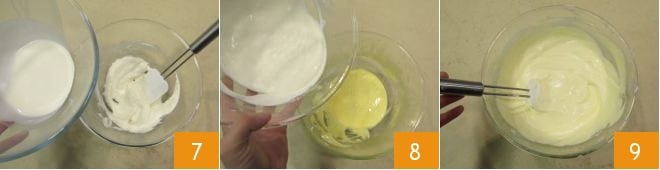 Ajoutez la crème restante (environ 80 g) 7 et mélangez encore pour bien amalgamer le tout. Maintenant, ajoutez le mélange obtenu à la pâte à bombe 8, en mélangeant délicatement avec une spatule de bas en haut pour l'incorporer 9. Couvrez le bol avec du film plastique et laissez refroidir la mousse de ricotta au réfrigérateur pendant au moins 2 heures.