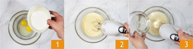 Pour préparer les gaufres sans beurre, commencez par casser les œufs dans un bol. Ajoutez le sucre 1 et commencez à fouetter avec les batteurs électriques jusqu'à obtenir une préparation claire et mousseuse 2. En continuant de fouetter, incorporez également l'huile en filet, lentement 3.