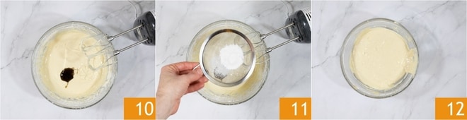 Parfumez en ajoutant l'extrait de vanille 10 et enfin tamisez la levure 11. Mélangez une dernière fois jusqu'à obtenir une préparation homogène 12.