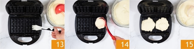 Huilez le gaufrier 13 et chauffez-le. Versez une petite louche de pâte dans le côté droit 14 et une autre dans le côté gauche 15. Fermez le gaufrier et faites cuire pendant 5 minutes.