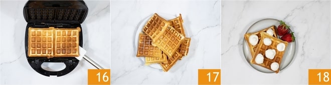 Quand elles sont bien dorées, à l'aide d'une spatule 16, transférez les gaufres dans une assiette. Si elles se sont jointes, il suffira de les couper. Continuez ainsi jusqu'à épuisement de la pâte 17. Avec ces doses, vous obtiendrez 10 grandes gaufres de 10x12 cm. Montez la crème avec le sucre et utilisez-la pour décorer les gaufres. Ajoutez les fraises et servez-les 18.