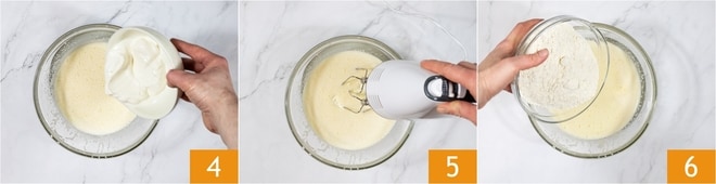 Ajoutez ensuite le yaourt 4 et battez encore avec les fouets pour l'incorporer 5. Ajoutez une partie de la farine 6.