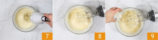 Continuez à battre avec les fouets 7 et ajoutez lentement la farine restante, jusqu'à obtenir une pâte consistante 8. Assouplissez avec le lait 9.