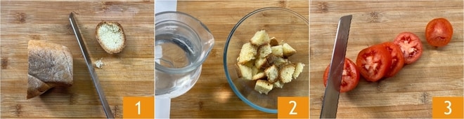 Pour préparer le gazpacho andalou, commencez par couper le pain rassis en morceaux 1, transférez-le dans un bol et couvrez avec 150 g d'eau 2. Laissez-le tremper quelques minutes pendant que vous préparez le reste des ingrédients : lavez et coupez les tomates en tranches 3.