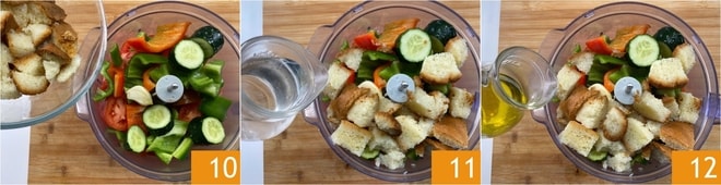 Ajoutez également le pain trempé et égoutté 10, puis versez les 250 g d'eau froide restants 11 et l'huile 12.