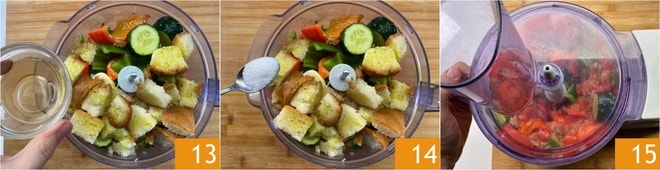 Enfin, ajoutez le vinaigre 13, le sel 14 et le poivre. Fermez et mixez pendant environ 30 secondes 15.