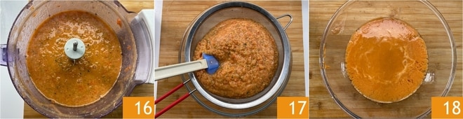 Lorsque vous avez obtenu un mélange homogène 16, transférez-le dans un tamis à mailles fines que vous aurez placé au-dessus d'un bol et pressez avec une spatule pour le filtrer 17. De cette façon, vous éliminerez les résidus de peau et obtiendrez une consistance lisse et fluide 18. Laissez reposer au réfrigérateur pendant au moins 2 heures, couvert de film plastique.