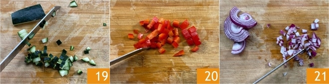 Après le temps de repos, préparez les ingrédients pour la décoration : coupez en dés le concombre 19, la tomate 20 et l'oignon rouge 21.