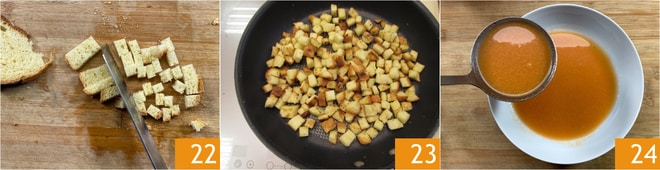 Réduisez également le pain en cubes 22 et faites-le griller à la poêle 23. Maintenant, reprenez le gazpacho du frigo et versez-le dans des assiettes 24.