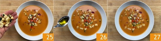 Garnissez avec les légumes et les cubes de pain grillé 25, puis assaisonnez d'un filet d'huile 26 et d'un tour de moulin à poivre. Votre gazpacho andalou est prêt à être dégusté 27 !
