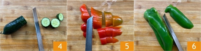 Faites de même avec les concombres sans les éplucher 4. Enfin, préparez les poivrons et coupez-les en morceaux, aussi bien les rouges 5 que les verts 6.