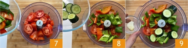 Mettez les tomates dans un mixeur, puis ajoutez les poivrons 7, les concombres 8 et la gousse d'ail 9.
