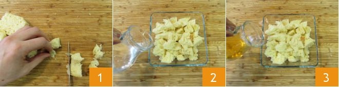 Pour préparer le gazpacho avec tartare de sériole, commencez par couper la mie de pain en morceaux 1 et transférez-la dans un petit bol, puis ajoutez 50 g d'eau 2 et 70 g de vinaigre de cidre 3.