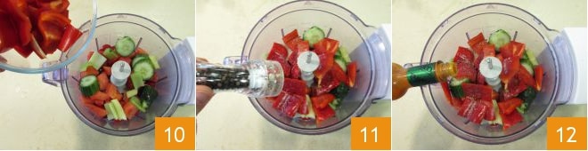 Ajoutez aussi les poivrons 10, du sel, du poivre 11 et quelques gouttes de Tabasco 12.