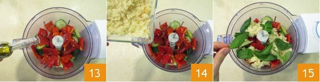 Enfin, ajoutez l'huile 13, le pain essoré 14 et quelques feuilles de basilic 15.