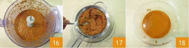 Mixez le tout jusqu'à obtenir une crème 16, puis tamisez-la 17 pour la rendre lisse et homogène 18.