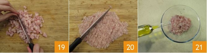 Occupez-vous maintenant de la Comment nettoyer la sériole et abaissée : coupez-la d'abord en dés 19 puis au couteau 20. Transférez-la dans un bol et assaisonnez avec de l'huile 21.