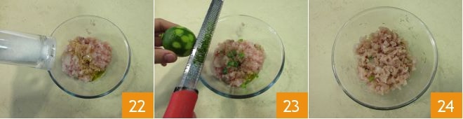 Ajoutez aussi du sel 22, du poivre et le zeste de lime 23, puis mélangez 24.