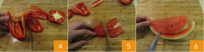 Nettoyez le poivron : éliminez la partie supérieure, puis coupez le reste en lamelles, en enlevant les graines et les filaments internes 4. Réduisez 140 g de pulpe en dés 5 et réservez. Coupez la pastèque en tranches et enlevez la peau 6.