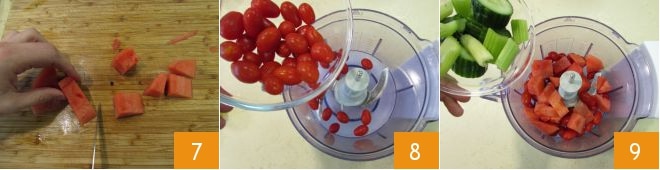 Réduisez 240 g de pulpe en morceaux 7. Lavez les tomates cerises, séchez-les et transférez-les dans le bol d'un mixeur équipé de lames 8 avec la pastèque, le concombre en rondelles et le céleri en morceaux 9.