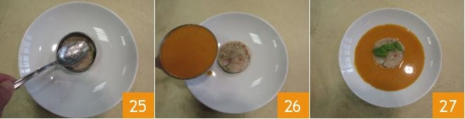 À ce stade, il ne vous reste plus qu'à composer le plat : placez un emporte-pièce de 10 cm au centre, disposez le tartare à l'intérieur et pressez-le délicatement avec le dos d'une cuillère 25. Retirez l'emporte-pièce, versez le gazpacho délicatement 26 et garnissez avec des feuilles de basilic. Votre gazpacho avec tartare de sériole est prêt à être servi 27 !