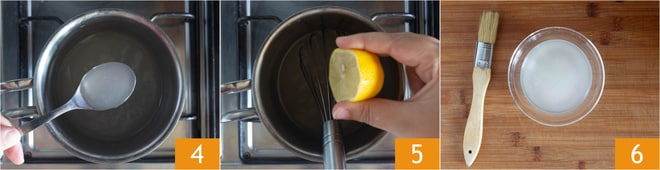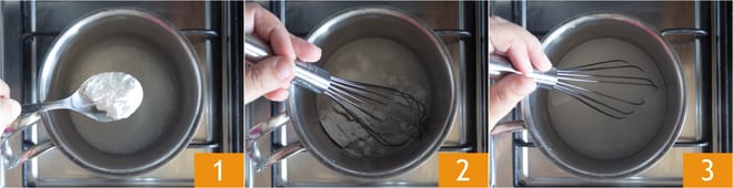 Pour préparer la gelée maison, mettez d'abord dans une casserole le sucre et la fécule de pommes de terre 1. Ajoutez une partie de l'eau prévue, mélangez pour dissoudre la fécule et le sucre sans former de grumeaux 2. Versez l'eau restante tout en continuant de mélanger 3.