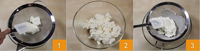 Pour préparer la glace à la ricotta, commencez par cette dernière. Mettez la ricotta au réfrigérateur à égoutter dans une passoire à mailles fines avec un petit bol en dessous et couvrez de film plastique. Vous pouvez le faire la veille au soir ou quelques heures avant la préparation pour faire perdre à la ricotta le sérum en excès. Ensuite, tamisez la ricotta avec une passoire et l'aide d'une spatule 1 ou avec le dos d'une cuillère et recueillez-la dans un petit bol 2. Répétez l'opération au moins 3 fois en tamisant la ricotta avec la spatule et la passoire pour la rendre plus crémeuse 3. Une fois tamisée, mettez-la de côté.