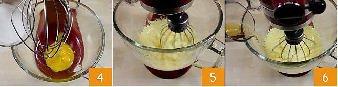 Puis continuez avec la préparation. Pour la glace à la ricotta, les œufs sont utilisés crus. Si vous le souhaitez, vous pouvez les pasteuriser en consultant le procédé de l'École de cuisine, en cliquant ici : Comment pasteuriser les œufs. Commencez à monter les jaunes avec le sucre glace : mettez les jaunes dans un batteur sur socle (ou dans un grand bol si vous utilisez un batteur électrique ou un fouet à main) et versez le sucre glace tamisé 4. Ensuite, montez les ingrédients jusqu'à obtenir une crème claire et mousseuse 5. Puis ajoutez le rhum (ou le marsala), en continuant à monter très délicatement le mélange 6.
