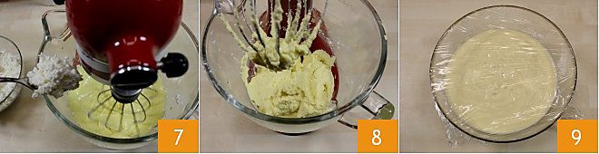 Maintenant, prenez la ricotta tamisée et ajoutez-la à la crème 7; montez encore quelques minutes pour obtenir un résultat crémeux 8. Maintenant que la préparation est prête, transférez-la dans un bol et couvrez-la de film plastique 9. Placez le bol au réfrigérateur pendant au moins 4 heures, pour que la glace se raffermisse. Pour une texture plus granuleuse et consistante, vous pouvez monter les jaunes et le sucre avec les fouets et ajouter la ricotta et l'arôme choisi à la main, en mélangeant avec une spatule.