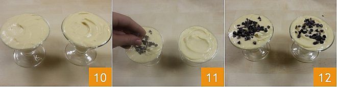 Passé le temps nécessaire, retirez le bol du réfrigérateur et versez la glace dans des coupes 10 avec une cuillère ou avec une poche à douille munie d'une douille lisse. Vous pouvez garnir votre glace à la ricotta de gouttes ou de copeaux de chocolat (11-12), ou vous pouvez la garnir selon les goûts de vos invités : avec des éclats de noisettes, des biscuits entiers ou émiettés, des feuilles de menthe ou l'accompagner de fruits frais ! En alternative, pour une texture de "semifreddo" vous pouvez créer une préparation plus granuleuse et crémeuse comme indiqué dans la deuxième séquence : tapissez des moules de papier sulfurisé humide, remplissez-les avec la crème obtenue et mettez-les au réfrigérateur couverts de film plastique pour qu'ils se raffermissent. Une fois le temps écoulé, démoulez-les en les retournant sur des assiettes à dessert !