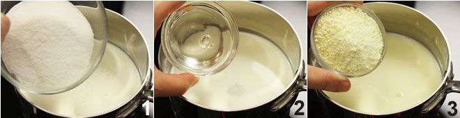 Pour préparer le yaourt glacé, versez la crème et le lait dans une petite casserole, ajoutez le sucre 1, le glucose 2 et la farine de caroube 3 puis mélangez pour dissoudre tous les ingrédients : portez le mélange à 80-85°, puis, une fois la température indiquée atteinte, placez immédiatement la casserole dans un bain-marie d'eau froide et de glace pour abaisser rapidement la température. Couvrez la casserole avec un couvercle et mettez au réfrigérateur pour bien refroidir pendant au moins deux heures.