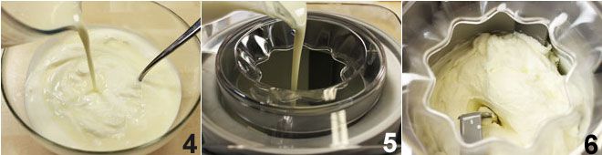 Lorsque le mélange est bien froid, incorporez-le au yaourt 4 (également très froid), mélangez pour amalgamer les ingrédients, puis mettez le tout dans la sorbetière 5 et laissez turbiner pendant au moins une demi-heure ou jusqu'à ce que la glace soit crémeuse et très dense 6. Versez la glace dans un récipient avec un couvercle et mettez au congélateur pendant au moins trois à quatre heures.