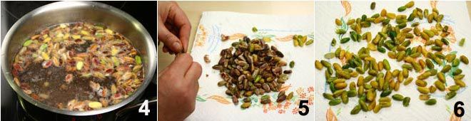 Occupez-vous ensuite des pistaches : pour les éplucher, il suffira de les blanchir pendant quelques minutes dans une petite casserole 4, puis de les égoutter et de les poser sur un morceau de papier absorbant pour sécher l'excès d'eau. La peau se détachera facilement en exerçant une légère pression avec les doigts (5-6).