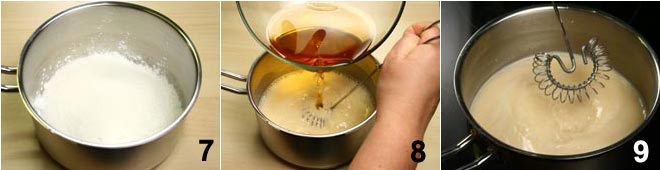 Dans une petite casserole, mélangez l’amidon et le sucre 7, puis ajoutez l’eau filtrée 8. Mettez la casserole sur le feu et mélangez jusqu'à ce qu'elle épaississe 9.