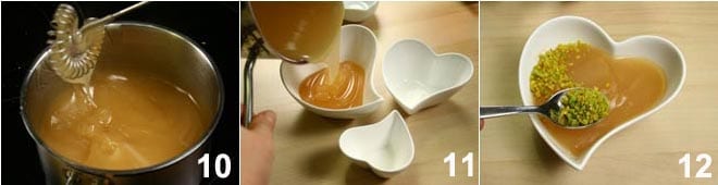 Une fois qu'elle aura atteint une consistance visqueuse 10, éteignez le feu et versez la gelée de cannelle dans les petits bols 11 et laissez refroidir. Servez la gelée de cannelle en saupoudrant la surface de pistaches hachées 12.