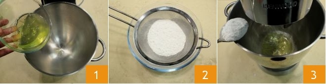 Pour préparer les couronnes de Meringue à la française, prenez les œufs et séparez les jaunes des blancs. Versez les blancs dans un batteur muni d'un fouet 1 et commencez à les monter en neige ferme ; tamisez le sucre glace dans un bol 2 et ajoutez-le une cuillère à la fois aux blancs 3.