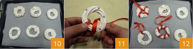 Quand les meringues seront prêtes 10, laissez-les refroidir, puis décorez-les avec des rubans de satin colorés 11 : vos couronnes de meringues sont prêtes 12 !
