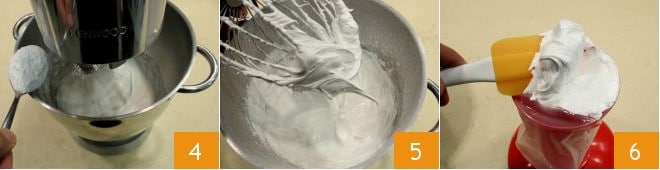 Continuez avec le batteur 4 jusqu'à obtenir une meringue blanche et mousseuse 5. À l’aide d’une spatule, placez la meringue que vous avez obtenue dans une poche à douille avec une douille étoilée 6.